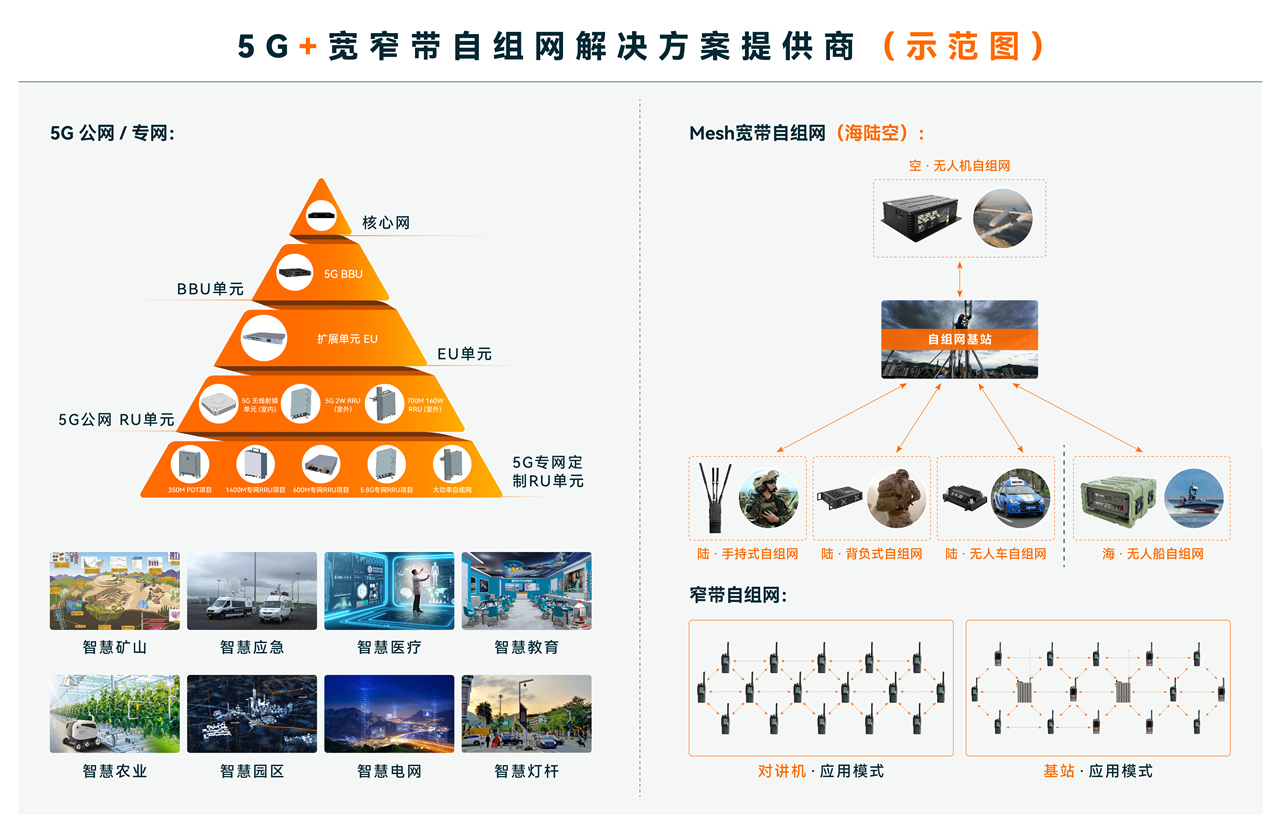 主要研发、生产、销售5G全网络设备/5G小甚基站MNet宽窄带自组网等,提供全球5G公网和行业通信专网设备,以及一站式无线通信解决方案。产品和方案已广泛应用于煤矿、应急、保险、智慧杆、智慧园